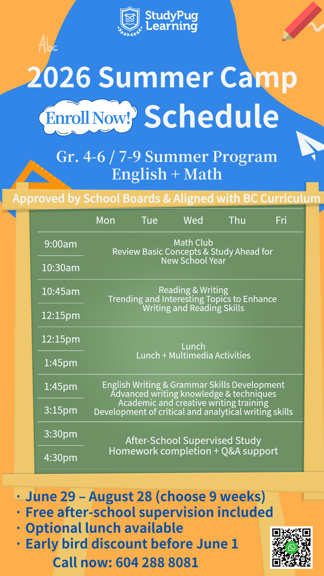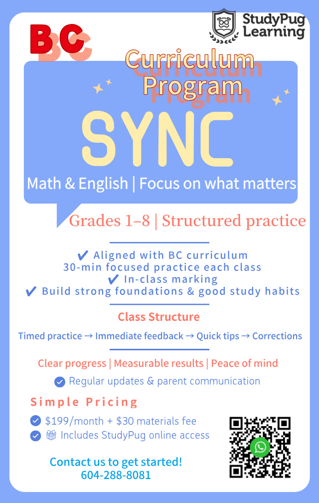 StudyPug Learning Advantage:Unlike programs that use American curriculum materials, every exercise in our Sync Class is 100% aligned to BC provincial learning standards. Teachers grade work on site with instant feedback. Parents receive monthly progress reports with specific skills covered — clear progress, measurable results. Every student receives a complimentary StudyPug.com subscription (approved by school boards) for review at home.